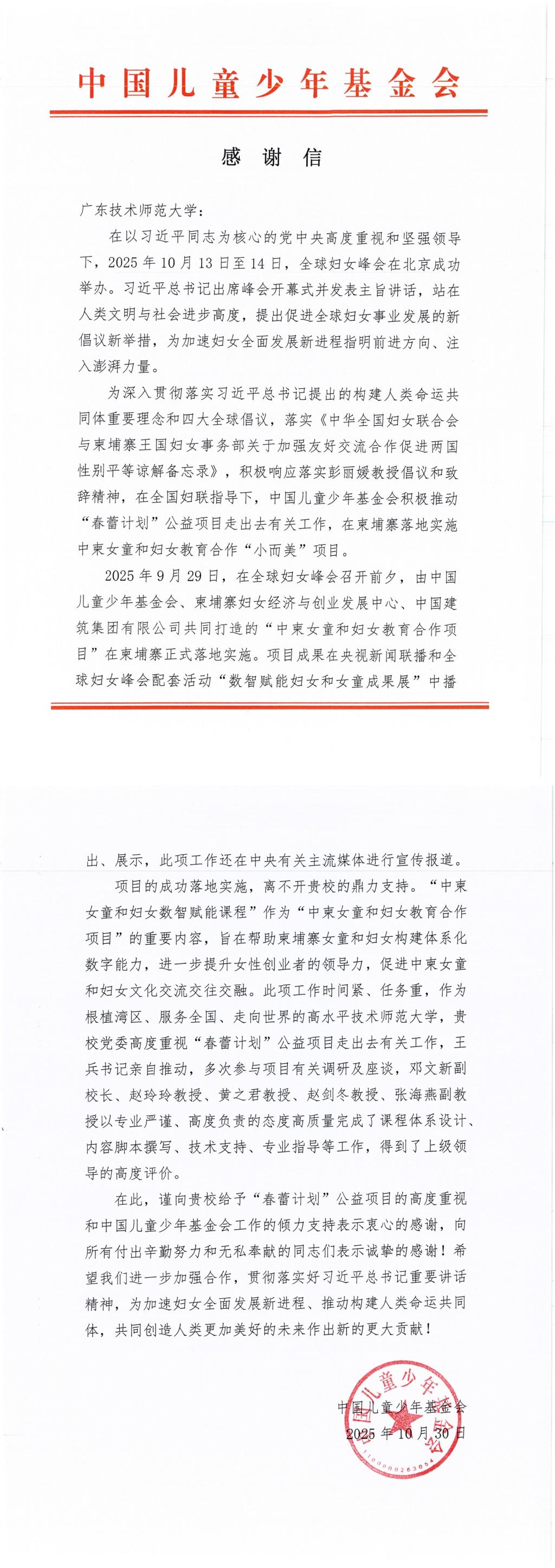 近日,中國兒童少年基金會向廣東技術師范大學發來感謝信,對我校在“中柬女童和婦女教育合作項目”中的鼎力支持與突出貢獻表示誠摯感謝。我校趙玲玲教授團隊承接的數智賦能課程作為項目核心,隨項目成果亮相央視新聞聯播與全球婦女峰會配套展覽,成為中柬合作的亮點。9月29日,由中國兒童少年基金會、柬埔寨婦女經濟與創業發展中心及中國建筑集團有限公司聯合打造的“中柬女童和婦女教育合作項目”在柬埔寨正式落地實施。該項目...